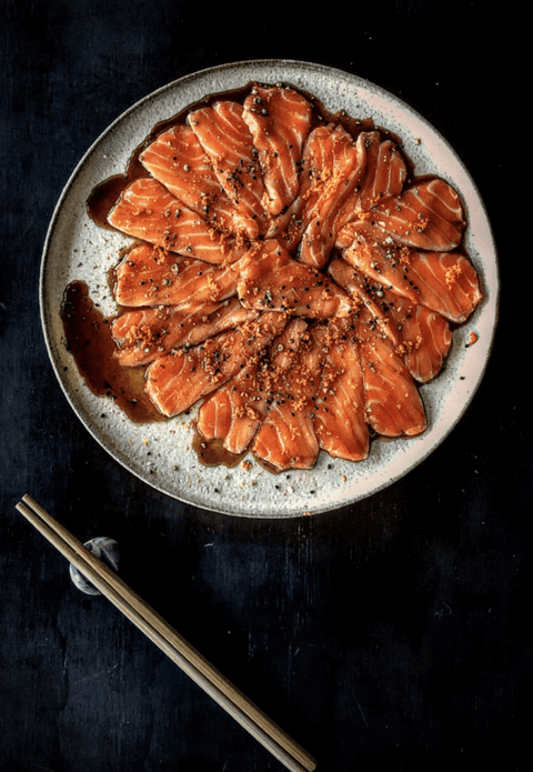 Ora King Salmon makes for a rich, delicious sashimi. Here it's complimented with yuzu juice, grated fresh turmeric and a touch of Togarashi spice.